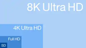 Зображення у форматі 8K у 4 рази вище и ширше, а ніж звичайне зображення Full HD (1080p з роздільною здатністю у 1920 × 1080 пікселів). Це означає, що роздільність дисплею UHDTV-Зображення, у 16 разів більше ніж зображення HDTV (загалом 33,2 Мегапіксель)