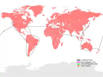- Склад «Великого Білого флоту»: пре-дредноути «Коннектикут», «Канзас», «Вермонт», «Луїзіана», «Джорджія», «Нью-Джерсі», «Род-Айленд», «Вірджинія», «Міннесота», «Мен», «Міссурі», «Огайо», «Алабама», «Іллінойс», «Кірсадж», «Кентуккі»; ескадрені міноносці «Гопкінс», «Стюарт», «Галл», «Тракстон», «Лоуренс», «Віппл», «Арет'юза»; допоміжні військові судна «Калгоа», «Гласіер», «Пантер», «Янктон», «Реліф».