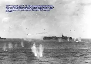 Вдень 4 січня 1945 року, коли «Оммані Бей» перебував в морі Сулу, він був атакований камікадзе. Літак врізався в політну палубу з правого борту корабля. Дві бомби пробили політну палубу. Одна з них вибухнула в ангарі, спричинивши пожежі та вибухи повністю заправлених та споряджених літаків; друга пробила ангарну палубу та вибухнула на другій палубі. Спроби загасити вогонь не увінчались успіхом, і о 17-50 була віддана команда залишити корабель.
