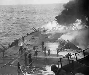 До 18.00 пожежі в ангарній палубі та бортових танках вдалось загасити, 12-метрову пробоїну з правого борту прикрили пластирем. Прийом літаків припинили, допоки з палуби не скинули палаючі машини. Але о 18.46 налетіли ще 5 камікадзе. Чотири з них вдалось збити на досить безпечній відстані, проте п'ятий скинув бомбу, яка вибухнула на політній палубі, а сам упав за бортом. Тим не менше, «Саратога» з 20.05 знову почав приймати літаки на кормову частину політної палуби, а для їх запуску доводилось йти заднім ходом, тому що злетіти вони могли тепер тільки з корми. 36 літаків згоріли чи були скинуті за борт, ще 6 сіли на воду та потонули, 123 члени екіпажу загинули, 192 — поранені.