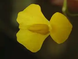 Вид дає квіти середнього розміру яскраво-жовтого кольору. Квітки мають дволопатеву нижню губу віночка і дуже бульбастий центр. Верхня віночкова губа велика і приблизно такого ж розміру, що й нижня. Шпора вигнута і загострена. Квітконіжка тонка і сильно закручується навколо навколишніх осок для підтримки[1].