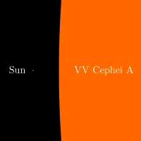 VV Цефея B, блакитна зоря головної послідовності класу B0, приблизно в 10 разів більше Сонця за радіусом, до 20 разів — за масою, і в 10 000 раз — за світністю .