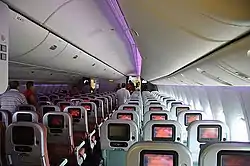 - пасажирські салони класу International Economy Class[21] літаків Boeing 777-300ER були скомпоновані за схемою 3-3-3. Крісла мали розміри в довжину 81 см, в ширину — 48 див. Пасажирські місця були оснащені індивідуальними 9-дюймовими сенсорними екранами PTV з системою AVOD розваги в польоті, розетками електроживлення для ноутбуків, USB-портами і лампи індивідуального освітлення.