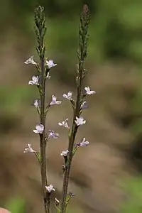 Багаторічна трава. Стебел 1–3 від основи, від лежаче-висхідних до випростаних, 30–75 см, від щільно щетисто-волосатих до волосатих, залозистих. Листя: базальне та нижнє стеблове стійкі, переважно ланцетні звужені до основи, проксимальні та середньостеблові листові пластини 3–8(9) см x 6–25 мм, відносно рівних розмірів або швидко стає вужчими, поля зубчасті, обидві поверхні волосаті, рідко залозисті, від сидячих до субсидячих. Плодових колосів 1 або 3(5) з дистальних гілок, відкриті та відносно стрункі (плоди не перекриваються або лише злегка), 6–20(25) см; приквітки від яйцювато-трикутних до трикутно-ланцетних, 3.5–4 мм, рівні або трохи коротші, ніж черешки. Чашечки 3.5–4 мм, жорстко-волосаті, частки трикутні, не злиті разом. Віночки від фіолетового до блідо-пурпурного або білого кольору з рожевими трубками, трубки 4.5–5 мм, на 1–1.5(2) мм довші за чашечки. Горішки 1.8–2.1 мм, легко відокремлюються[1].