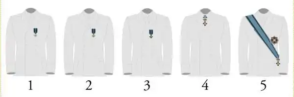 | 1 – Срібний Хрест, 2 – Золотий Хрест', 3 – Кавалерський Хрест, 4 – Командорський Хрест, 5 – Великий Хрест (з зіркою)| | ||||