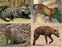 - Гієнові (Hyaenidae), 4 роди, 4 види — Африка, південь Азії