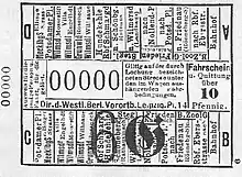 Квитки за 10 пфенігів були білого кольору, 15 пфенігів — рожевого і 20 пфенігів — зеленого кольору. Починаючи з 1904 року транзитні[n 1] та шкільні квитки видавалися відповідно до принципів, прийнятих в GBS. Спочатку місячний квиток на одну лінію коштував 7,50 марок, на дві лінії — 10 марок, на три лінії — 13 марок і на всю мережу — 15 марок. Після введення податку на квитки з 1 серпня 1906 року ціна збільшилася до 7,70, 10,20, 13,40 і 15,40 марки. Студентські місячні квитки на дві лінії були доступні за три марки, а кожна додаткова лінія збільшувала ціну квитка на одну марку. Тижневі пільгові квитки для робітників (на шість подвійних поїздок) продавали за одну марку[16][17].