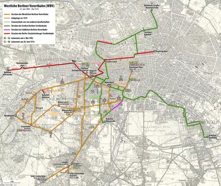 Акціонерне товариство Westliche Berliner Vorortbahn засновано 25 липня 1898 року. Від 1 жовтня йому став належати Berliner Dampfstraßenbahn-Konsortium, який керував декількома лініями в південно-західних передмістях Берліну. У рік свого заснування Große Berliner Straßenbahn (GBS) викупила весь акціонерний капітал компанії. WBV розпочала електрифікацію колій, яка була запланована ще в часи GBS.