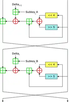 якщо n = 2 * i — 1 для 1 ≤ i ≤ 32, Rn+1 = Ln + ({ (Rn 4 Rn 5) Rn } ({ i — 1 } * δ K [ ({ i — 1 } * δ) 3 ]),