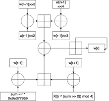 - Константа δ, виведена із Золотого перетину (δ = ( — 1) * 231 = 2654435769 = 9E3779B9h)[3] множиться на номер циклу (це було зроблено для запобігання простим атакам, заснованим на симетрії раундів).