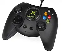 Xbox має 4 слоти для геймпадів, куди можуть підключатися також і різні аксесуари. Геймпад під назвою Duke спроектований так, щоб в будь-який момент легко перемкнутися з одного типу управління на інше, а всі елементи управління були однаково доступні, проте досить громіздкий, порівняно з контролерами інших консолей. Праворуч розташовані 6 кнопок, позначених буквами A, B, X, Y, і ще 2 кнопки — Біла і Чорна. Між хрестовиною і правою аналоговою ручкою розміщені кнопки Back і Start. На тильній стороні геймпада знаходяться два порти USB, до яких можна підключати карти пам'яті та інші пристрої. На зміну Duke згодом прийшов менший Controller S[6].